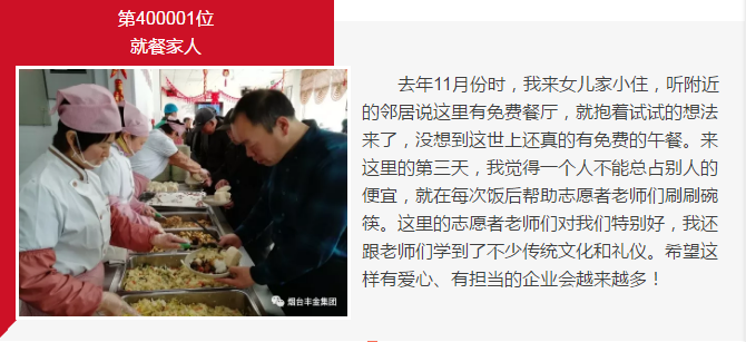 2018年3月17日,农历二月初一,丰金爱心餐厅用餐家人突破40万人次啦!