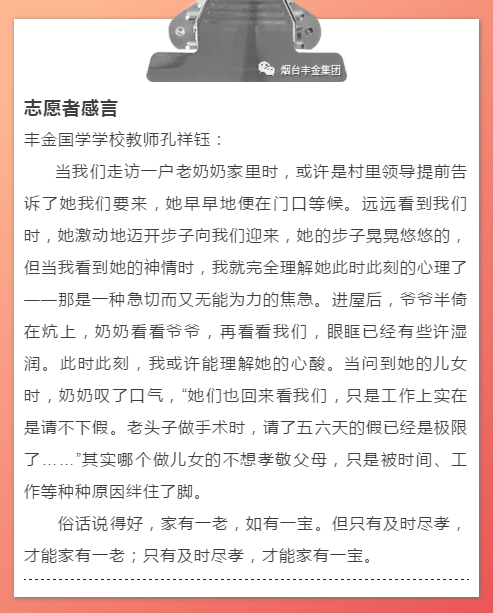“每家都会有生活的困难和艰辛。虽然我们的力量有限,但也要坚持走到这些困难家庭的心坎里去。也希望你们能坚定信心,不轻言放弃,相信日子一定会越来越好。”同时,也让我们一起接力爱的奉献,体验爱的力量。——丰金爱心在线,让爱与感动常在。