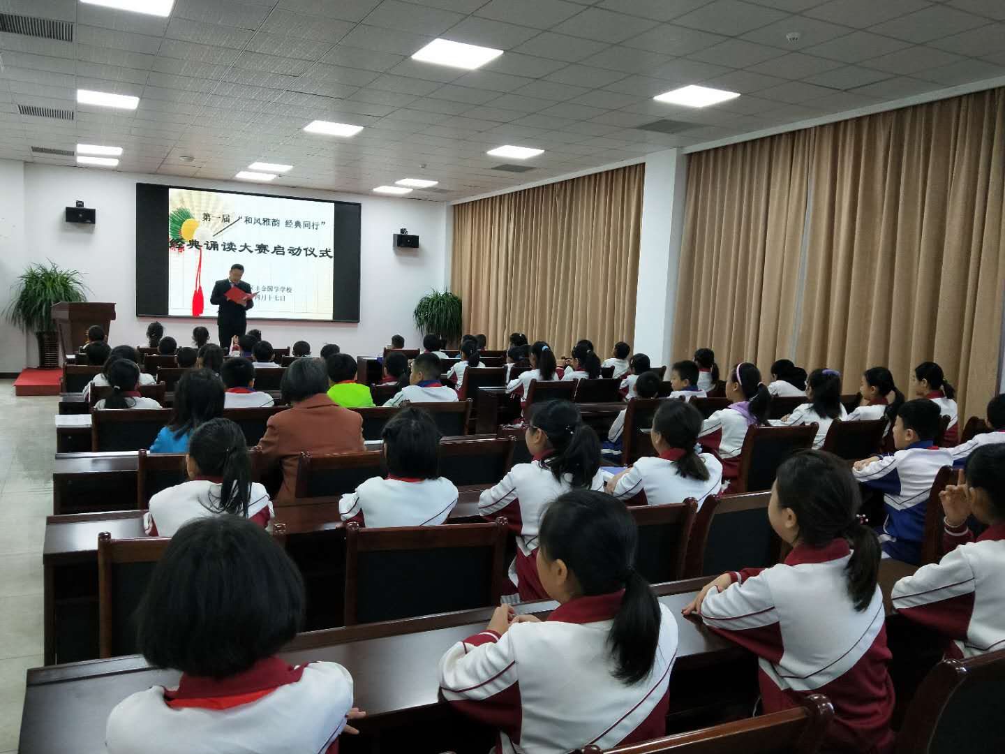 为进一步丰富校园文化生活,营造浓厚的书香校园氛围,传承国学文化经典,弘扬民族文化精髓,培养学生每日诵读经典的良好习惯,4月17日,在全校师生的共同参与见证下,“和风雅韵 经典同行”——烟台市牟平区丰金国学学校第一届经典诵读大赛正式启幕。
