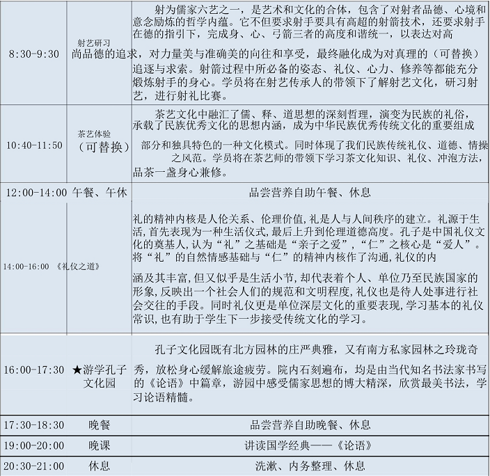 (包含:国学课程费、国粹体验费、住宿费、餐费、景点大门票、导服费、活动道具、活动场地费、往返大交通费用)