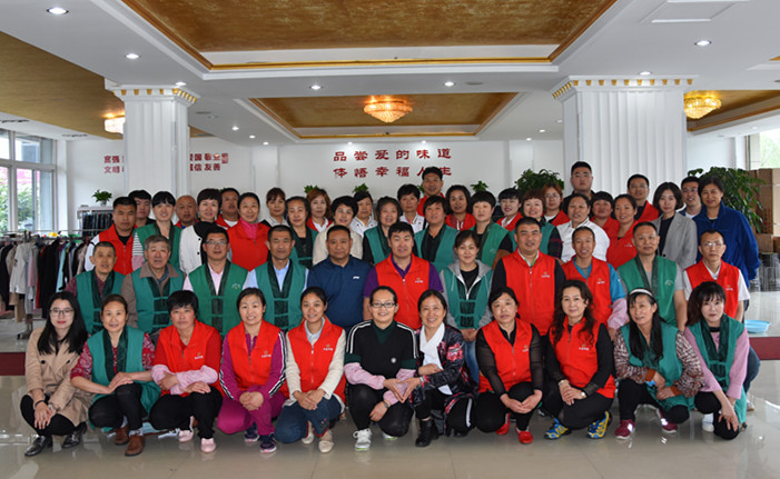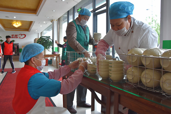 虽然下着雨,但早上7点左右,专门从芝罘店、牟平店和蓬莱店赶来的几十位身着统一服装的志愿者们一到达开发区店,便立马投入到准备工作中。为了给家人们提供最好的服务,在正式就餐前,大家一直在练习当天的服务流程。