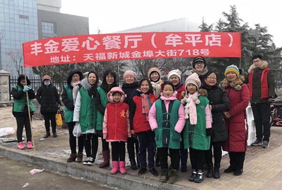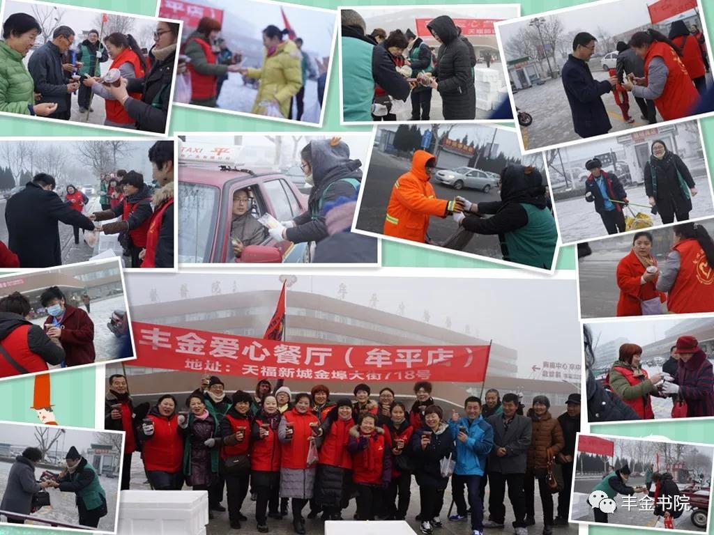 1月13日是传统节日“腊八节”,早晨7点,丰金爱心餐厅牟平店、芝罘店、蓬莱店、烟台开发区店的志愿者们走上城区街头,十几个发放点同时启动,在寒冬中为过往市民送上一份节日的温暖祝福。150多名志愿者组成了浩浩荡荡的爱心队伍,与清晨的雾凇共舞,共唱一曲人间大爱之歌。