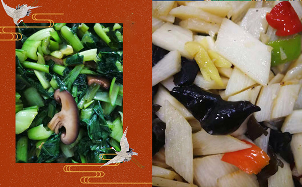 晚餐:米饭 干炸黄花鱼 烧冬瓜 白菜豆腐粉条 紫菜蛋花汤 水果