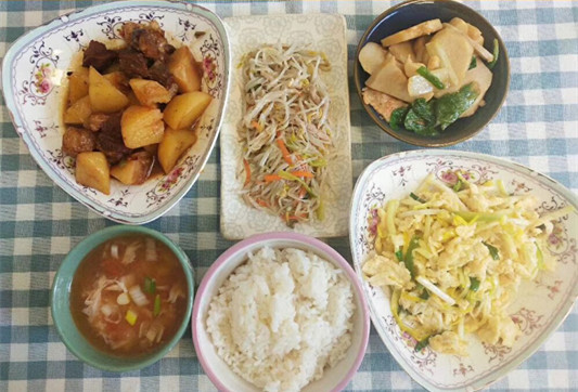 午餐:米饭 土豆烧牛肉 蒜黄炒鸡蛋 肉丝豆芽 芋头炖小白菜 西红柿蛋汤