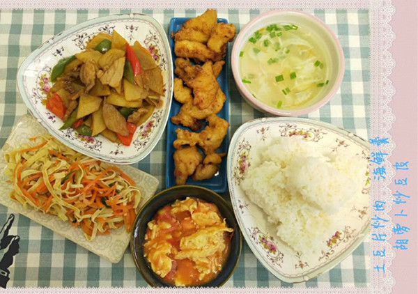 午餐:米饭 土豆烧鸡块 滑蛋虾仁 菜花炒肉 肉片圆白菜 西红柿蛋汤