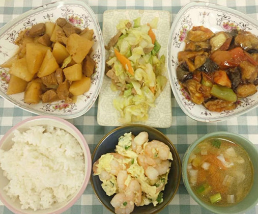 午餐:米饭 土豆烧肉 滑蛋虾仁 肉片圆白菜 红烧茄子 西红柿蛋汤