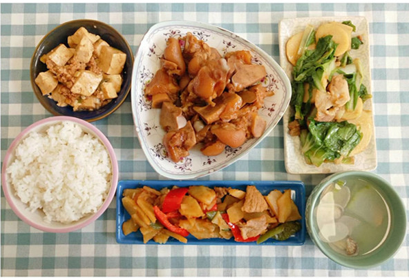 午餐:米饭 红烧猪手 小白菜炖芋头 青椒土豆片 肉末烧豆腐 冬瓜花蛤汤
