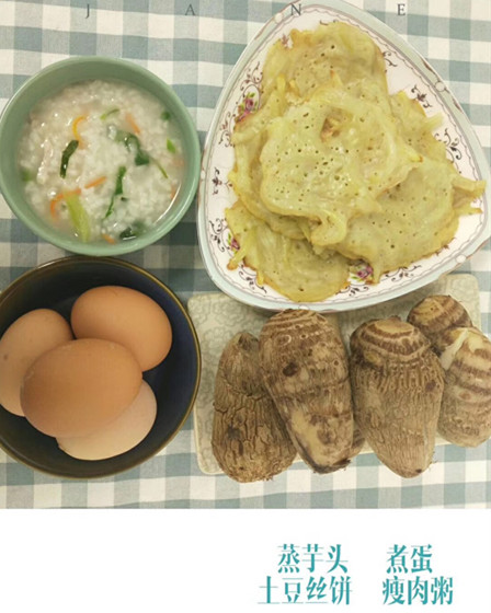 早餐:土豆丝饼 煮蛋 蒸芋头 瘦肉粥