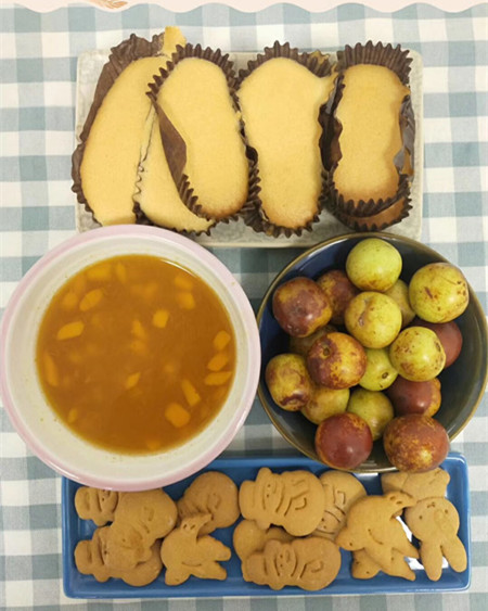 间餐:鲜枣 枸杞饼干 蛋糕 小枣南瓜羹