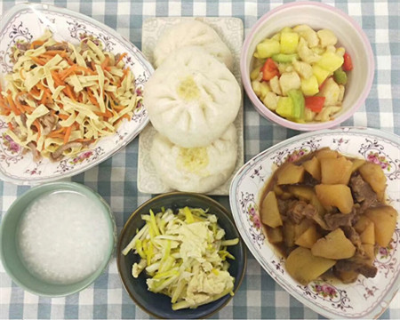 午餐:黄金米包 菠萝鸡丁 蒜黄炒鸡蛋 胡萝卜炒豆皮 土豆烧牛肉 大米粥