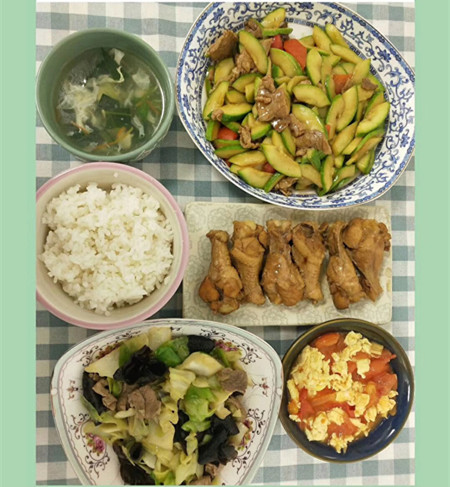 午餐:米饭 红烧翅根 西红柿炒鸡蛋 肉片西葫芦 木耳圆白菜 菠菜汤