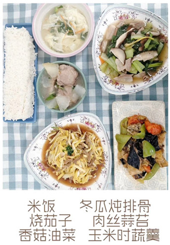 午餐:米饭 冬瓜炖排骨 烧茄子 肉丝蒜台 香菇油菜 玉米时蔬羹