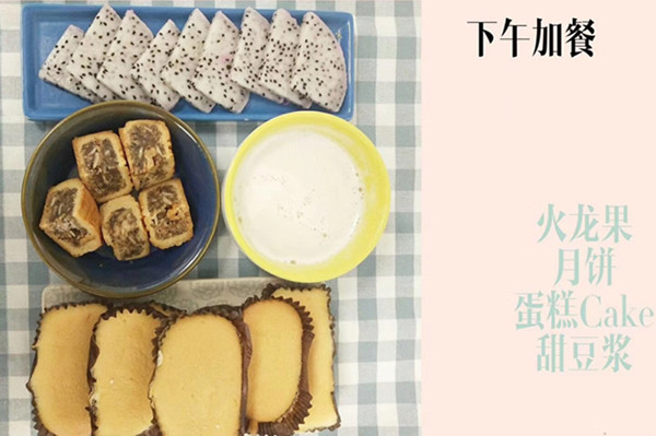 间餐:火龙果 月饼 蛋糕 甜豆浆