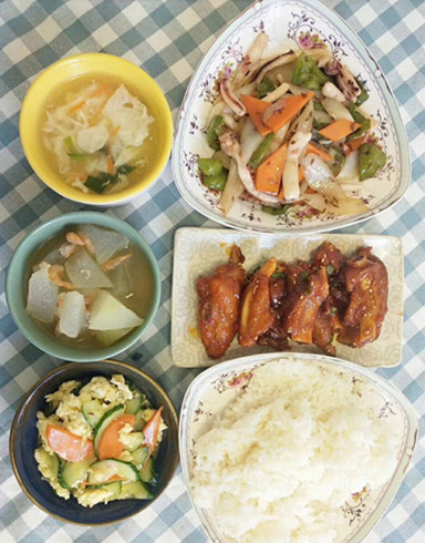 午餐:米饭 红烧大虾 小白菜炖芋头 三色肉丝 西红柿鸡蛋 冬瓜花蛤汤