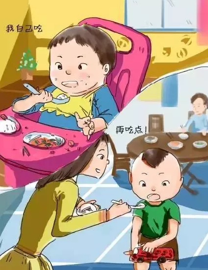 现在很多家长,特别是祖父祖母,总是担心孩子吃不饱,恨不得替孩子吃饭。也有的爸爸妈妈嫌孩子自己吃饭又脏又麻烦,看到孩子吃饭笨手笨脚的,索性就一喂了之。