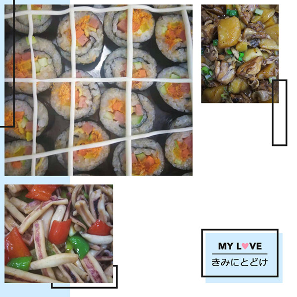 午餐:发面饼 寿司 山药海带排骨 葱烧千页豆腐 胡萝卜炒西兰花 豆腐鲜蔬汤 水果
