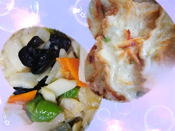 早餐:炒米饭 鸡蛋 南瓜小米粥 白菜炒蜇皮 炒疙瘩丝