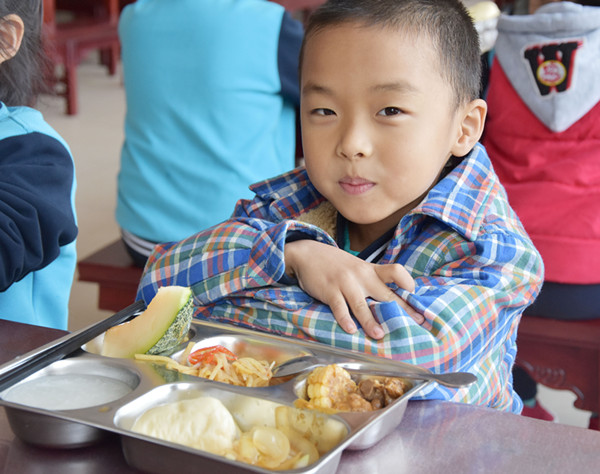 午餐:米饭 红烧肉 香菇烧油菜 醋烹绿豆芽 西红柿蛋汤 水果