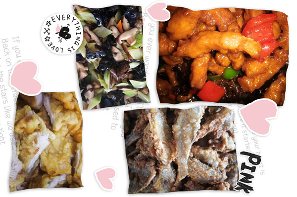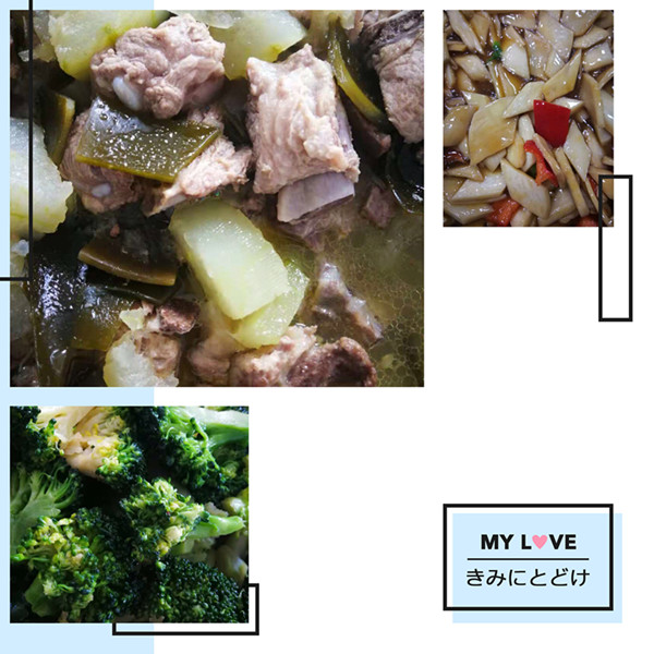 晚餐:米饭 黄金炸里脊 茭瓜炒鸡蛋 烧冬瓜 香菇豆腐汤 水果