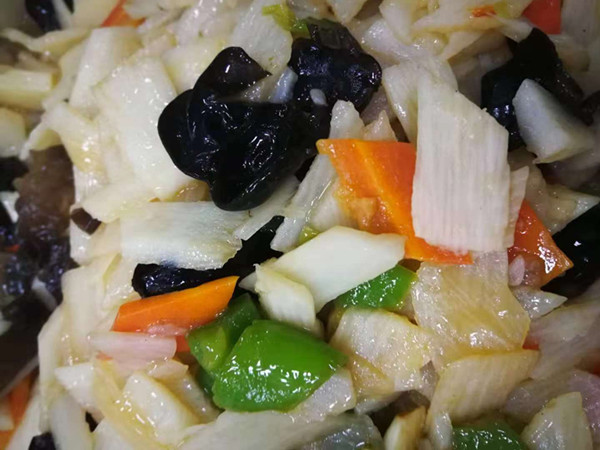 晚餐:米饭 珍珠圆子 干煸大头菜 醋烹绿豆芽 银耳马蹄汤 水果