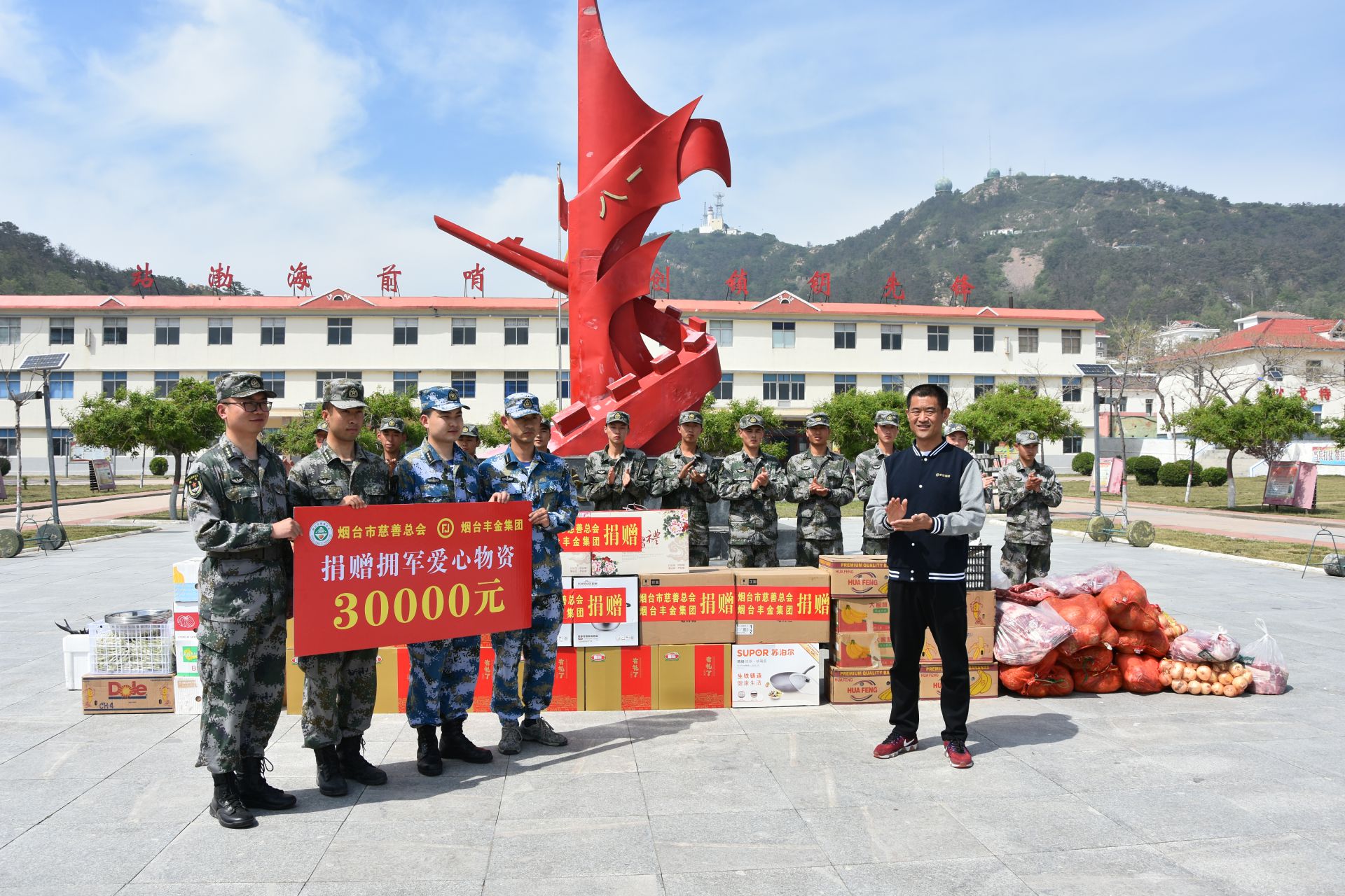 军爱民,民爱军是我国的优良传统。5月22日,丰金集团联合烟台市退役军人事务局、市慈善总会走进长岛边哨——北隍城岛,开展“拥军到一线 走进小散远”慈善拥军公益活动,为海岛艰苦的基层“小散远”连队送去了地方人民对子弟兵的关怀以及军民同心一家亲的美好祝福。此次活动,烟台丰金集团向驻岛部队捐赠了蔬菜、水果、鲜肉、排骨、喜旺礼盒60个、烤箱5个、餐具10套、家用厨房用品10套(每套包括1个蒸锅、1个电饭煲、1个炒锅、4个不锈钢洗菜盆)等价值3万元的爱心物资。为了让海岛官兵吃上最新鲜的蔬菜,丰金爱心在线的志愿者于出发前一晚联系了超市进行现采现摘,所有物资直到出发前7小时才配备齐全。