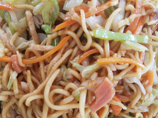 午餐:面条 三丝炒面 黄瓜鸡蛋炒面 培根 紫菜蛋花汤 水果(香梨)