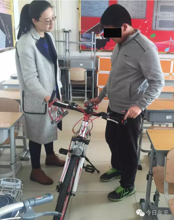 姜格庄小学三年级学生王磊(化名),父亲患castrewan淋巴结病,妈妈严重脊椎损伤,两人均无法从事体力劳动,家庭生活十分困难。记者了解到,当天,在接到工作人员的电话后,王磊的姥爷特意开着家里的农用三轮车拉着王磊的妈妈早早赶到学校。用王磊姥爷的话说,王磊一直想要一辆自行车,如今愿望终于实现了,这是一件大事,路途再远再辛苦,他们一家也想到现场见证一下。当一辆崭新的自行车交给王磊的时候,从他那惊奇的小脸上,记者看得出他的心里是多么的兴奋。工作人员帮其调试了自行车的高度后,王磊有些跃跃欲试,当场体验了一把骑车的感觉。
