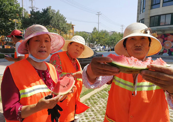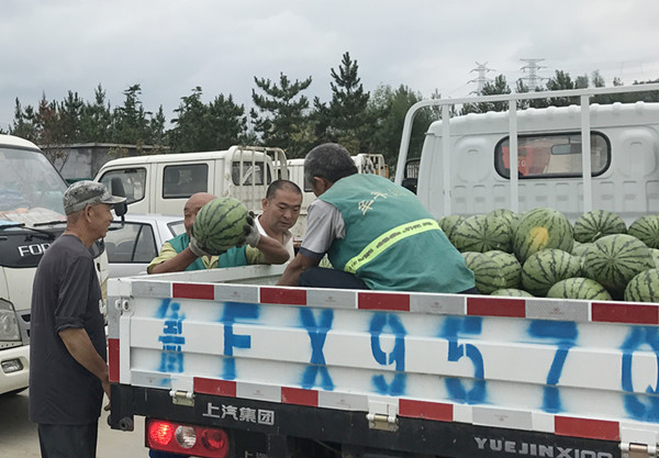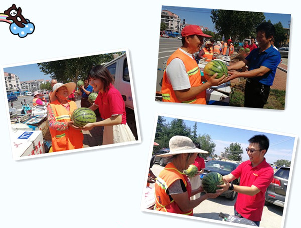8月16日,丰金爱心在线联合牟平区环卫工程有限公司、区园林处为我区500多名环卫工人和园林工人们送去9600多斤西瓜,感谢他们的默默坚守。