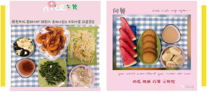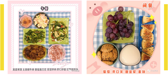 午餐:红小豆米饭、清炖排骨、土豆烧豆角、松子玉米、花菜炒肉、西红柿蛋汤