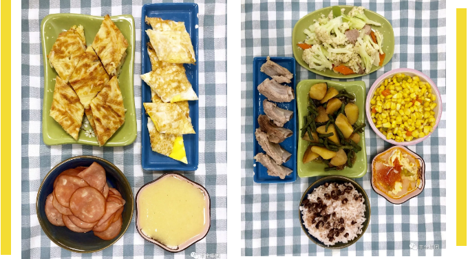 午餐:高粱米饭、土豆烧肉、蒜苔炒肉、木耳鸡蛋、蒜香菜豆、西红柿蛋汤