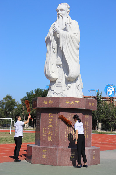 “尼山岩岩,洙泗泱泱;先师圣德,千古是望……”孔子祭文,师生齐诵。诵读之声响彻,赤诚之心尽诚。此时此刻,孔子颠簸求学、培育学子的经历如一幕幕镜头似在脑海闪现;先师有教无类、因材施教等智慧的教学方式在心田回荡。