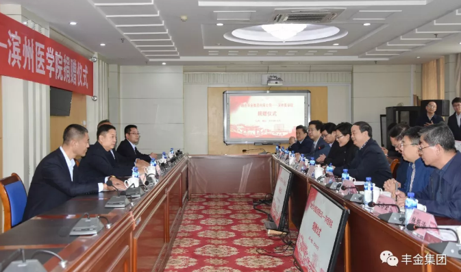 10月16日,烟台丰金集团向滨州医学院教育基金捐赠仪式在滨州医学院办公楼九楼会议室举行。滨州医学院党委书记车先礼、党委副书记李文喜、丰金集团董事长李林才,该校教育发展基金会全体成员,有关部门、院系负责人参加捐赠仪式。滨州医学院党委统战部部长杜永俐主持仪式。